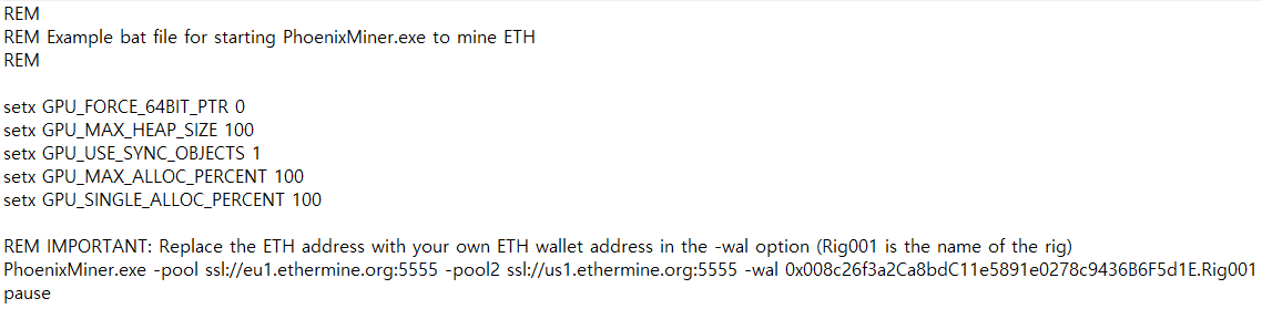 PhoenixMiner.exe 파일을 실행하여 채굴을 할 수 있는데, 이때 채굴 명령어(옵션)를 설정해야 합니다.