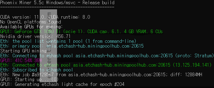 - PhoenixMiner 실행결과