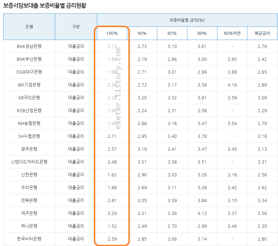 2020년 11월 ~ 2021년 1월 취급된 중소기업 (보증서담보대출)기준, 보증비율100% 기준으로, 금리를 낮은 순서로 나열하면 아래와 같습니다.