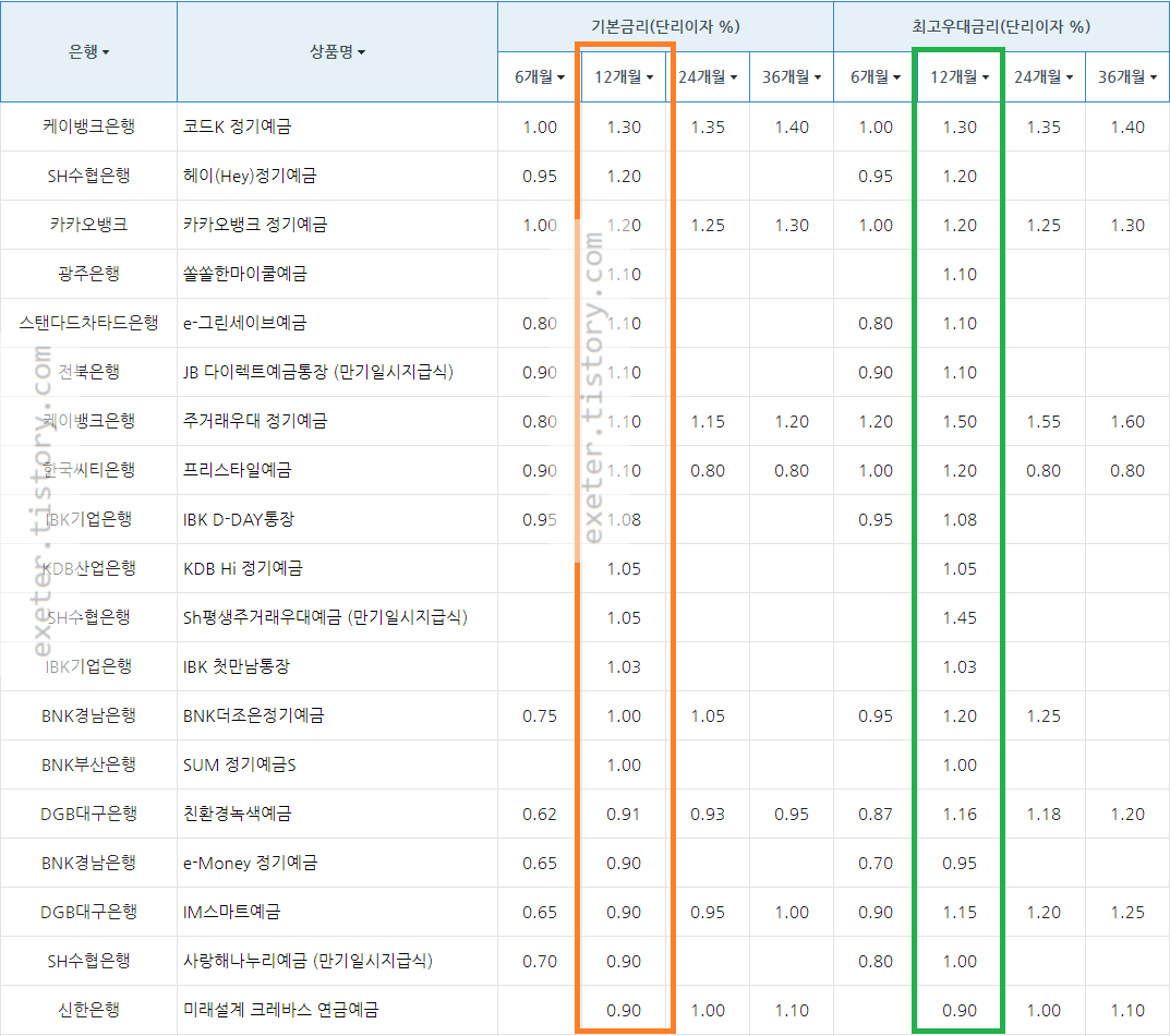 은행 / 상품명 / 기본금리 (단리 이자(%), 12개월 기준)
