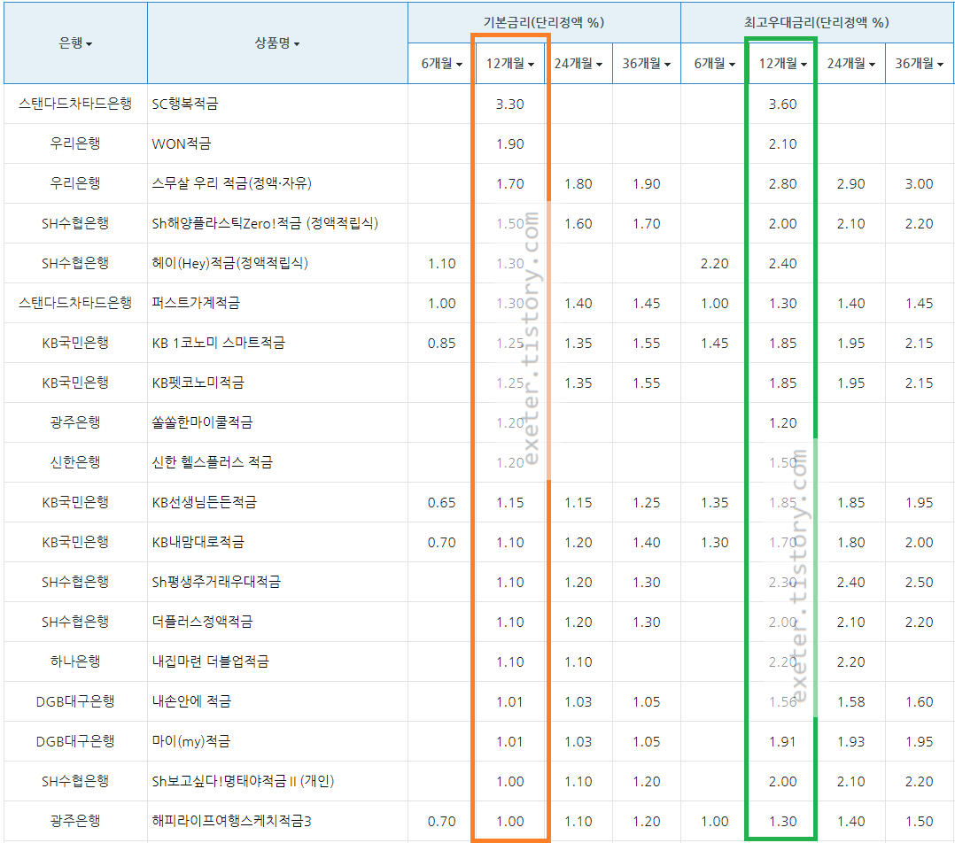 은행 / 상품명 / 정액 적립식 기본금리 (단리 이자(%), 12개월 기준)