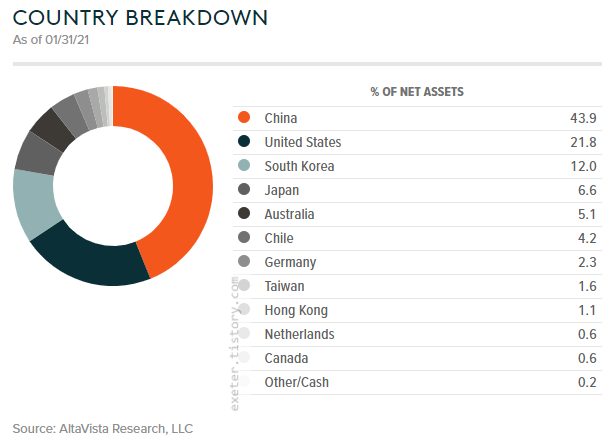 자산 구성을 국가별로 구분해 보면, 중국 시장이 43.9%로 가장 큰 범위에 포함되어 있고, 이후로 미국 21.8%, 한국 12.0%, 일본 6.6% 수준입니다.