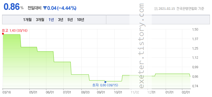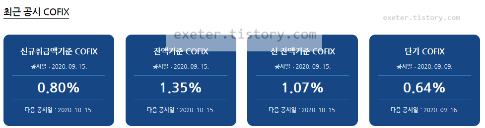 참고로 2020년 9월 15일 기준, 신규취급액 기준 코픽스(COFIX) 금리가 역대 최저치인 0.80% 였습니다.