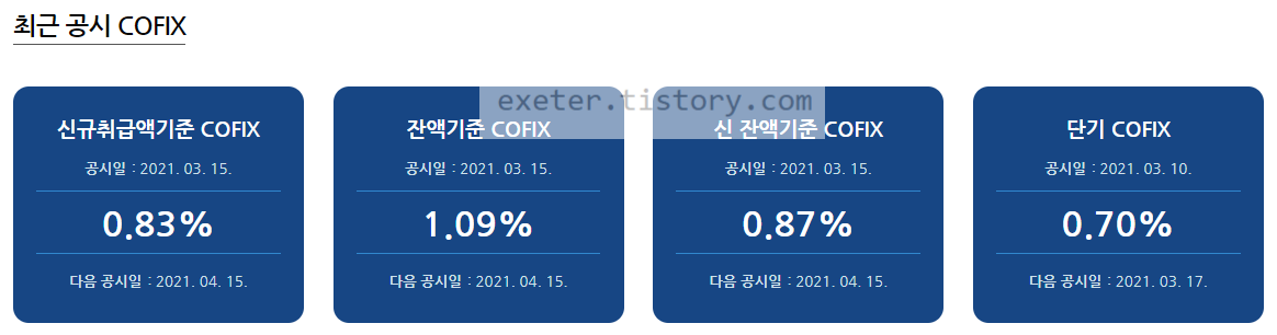 2021년 3월 15일 기준으로는 신규취금액 기준 코픽스 금리는 0.83%로 소폭 상승한 상태입니다.
