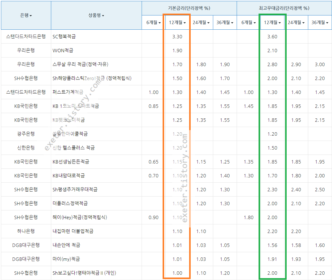 은행 / 상품명 / 정액 적립식 기본금리 (단리 이자(%), 12개월 기준)