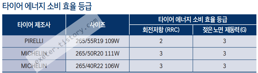 타이어 제조사: PIRELLI/MICHELIN 타이어 순정 사이즈 및 에너지 소비 효율 등급은 아래 그림 참고
