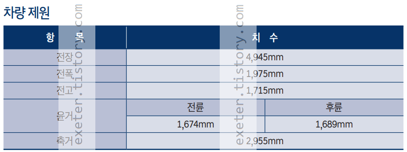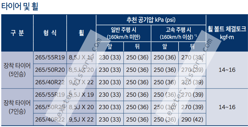 - 5인승 장착타이어: 265/55R19, 265/50R20, 265/40R22