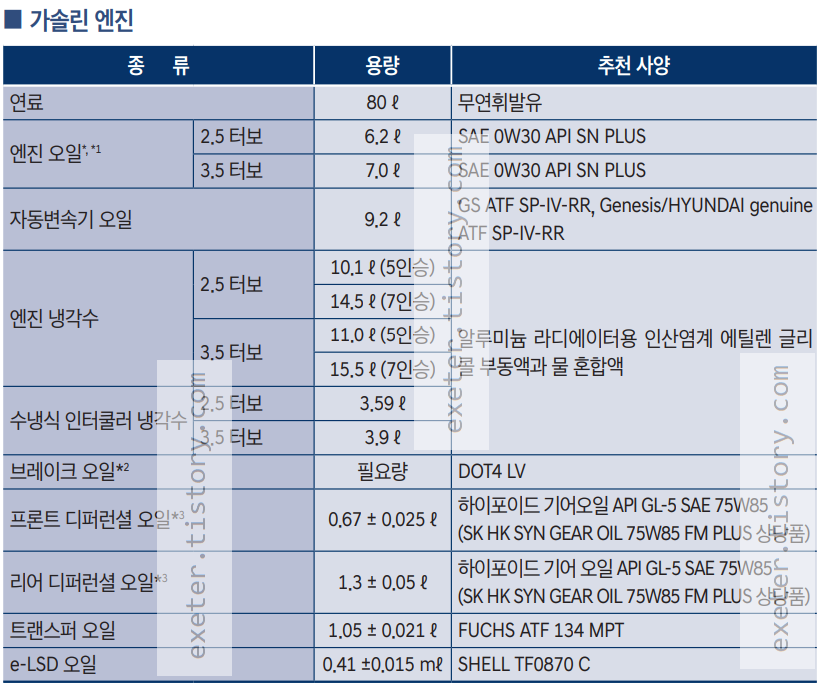 * : 2.5 터보 / 3.5 터보 엔진의 경우, 최적의 엔진 성능을 위해서는 고급 휘발유(RON 96 이상) 사용을 추천하며, 일반 휘발유 사용 시 문제는 없으나 출력이 다소 저하될 수 있고, 연료 소비가 증가할 가능성이 있습니다.