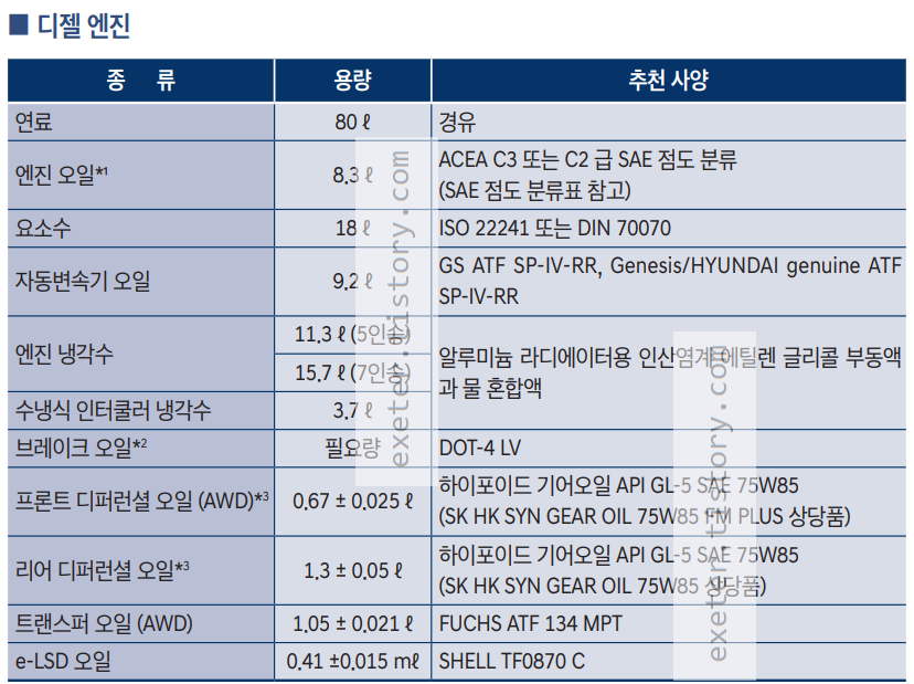 본 게시글은 디젤엔진 기준입니다. 엔진오일/변속기오일/냉각수/브레이크 오일/디퍼런셜오일/연료용량 등 각종 오일류의 용량(단위: L) 및 추천사양을 참고하시기 바랍니다.