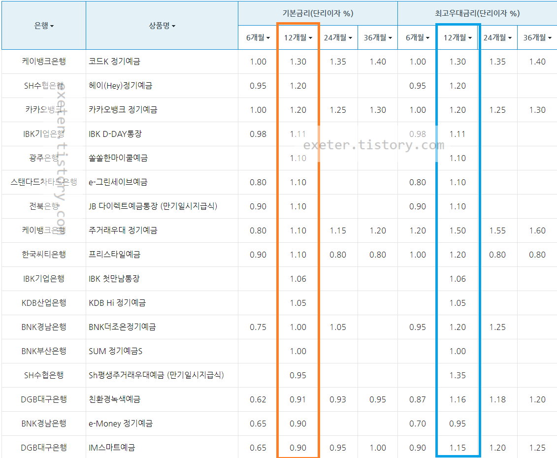 은행 / 상품명 / 기본금리 (단리 이자(%), 12개월 기준)