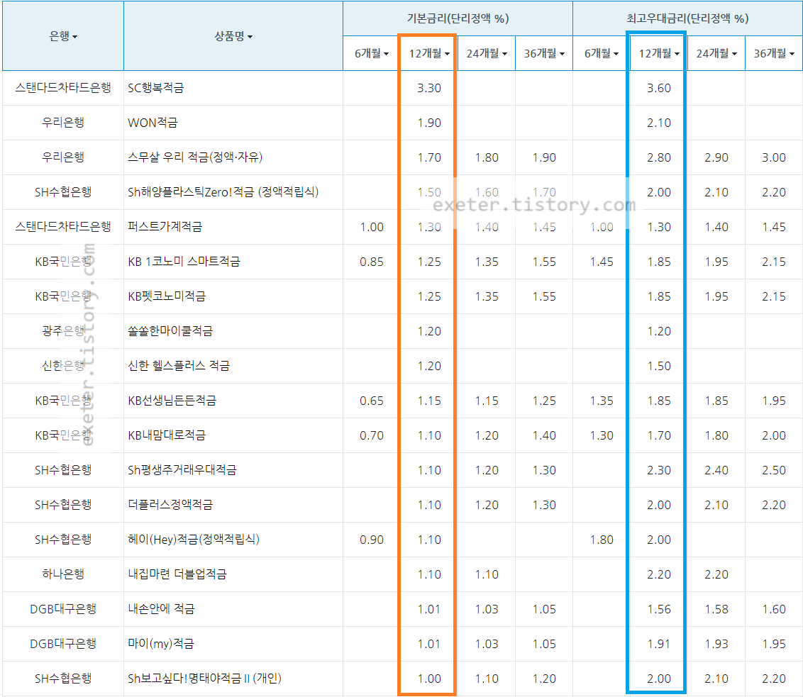 은행 / 상품명 / 정액 적립식 기본금리 (단리 이자(%), 12개월 기준)