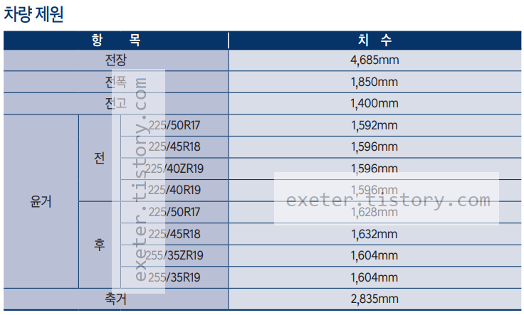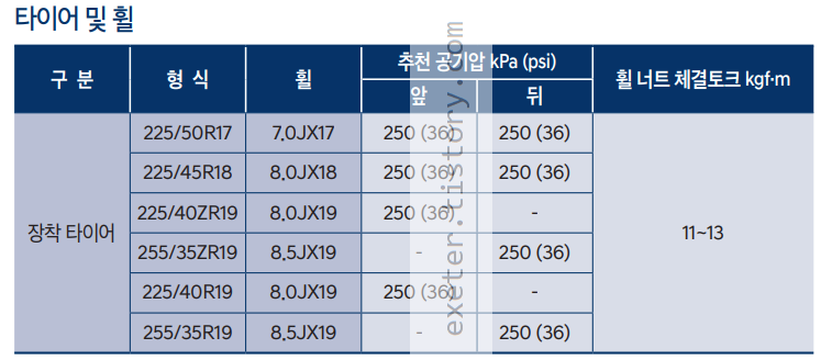 - 장착타이어: 225/50R17, 225/45R18, 225/40ZR19, 255/35ZR19, 225/40R19, 255/35R19