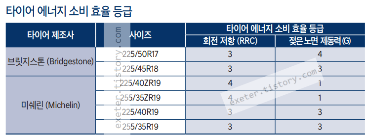 타이어 제조사: 브릿지스톤/미쉐린 타이어 순정 사이즈 및 에너지 소비 효율 등급은 아래 그림 참고