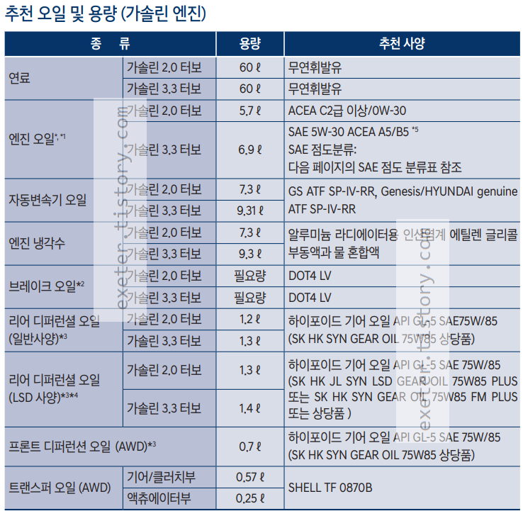 * : 2.0 터보 / 3.3 터보 엔진의 경우, 최적의 엔진 성능을 위해서는 고급 휘발유 (RON 96 이상) 사용을 추천하 며, 일반 휘발유 사용 시 문제는 없으나 출력이 다소 저하될 수 있고, 연료 소비가 증가할 가능성이 있습니다.