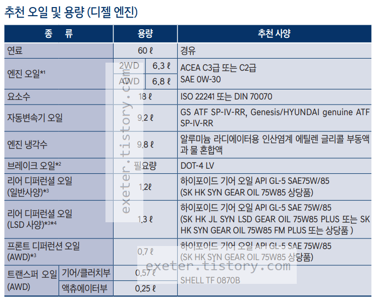아래 엔진오일/변속기오일/냉각수/브레이크 오일/디퍼런셜오일/연료용량 등 각종 오일류의 용량(단위: Liter) 및 추천사양을 참고하시기 바랍니다.