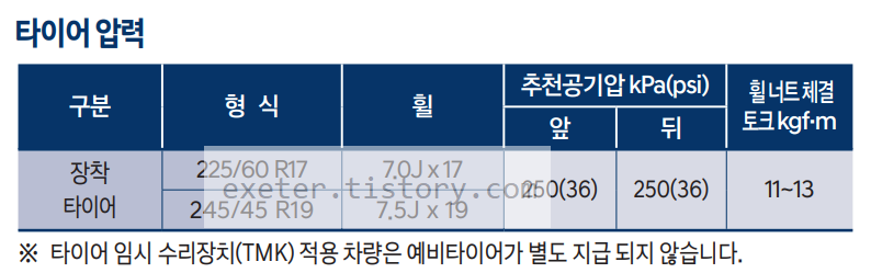※ 타이어 임시 수리장치(TMK) 적용 차량은 예비타이어가 별도 지급 되지 않습니다.