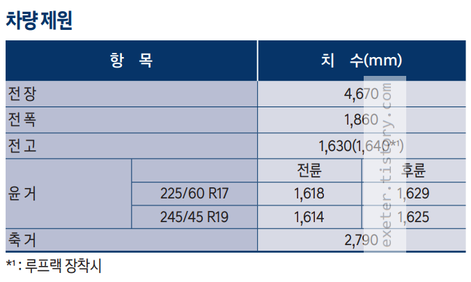 전고: 1,630/1,640 mm (루프랙 장착시)