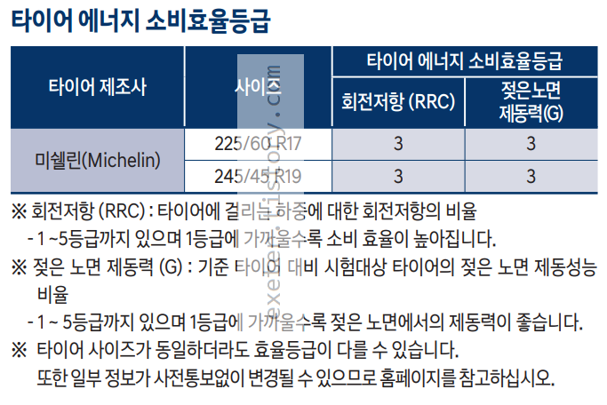 타이어 제조사: 미쉐린(Michelin) 타이어 순정 사이즈 및 에너지 소비 효율 등급은 아래 그림 참고
