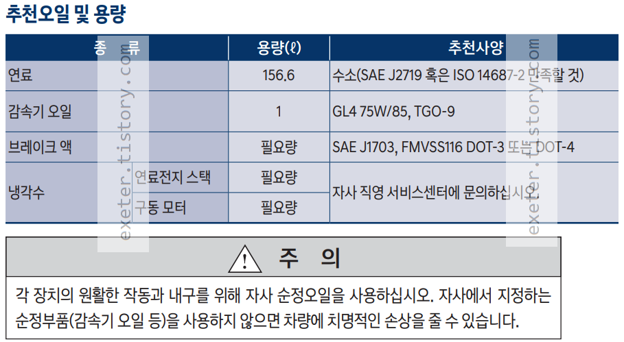따라서 넥쏘의 경우 일반 내연기관(가솔린) 차량 대비 필요한 오일 종류가 매우 단순합니다.