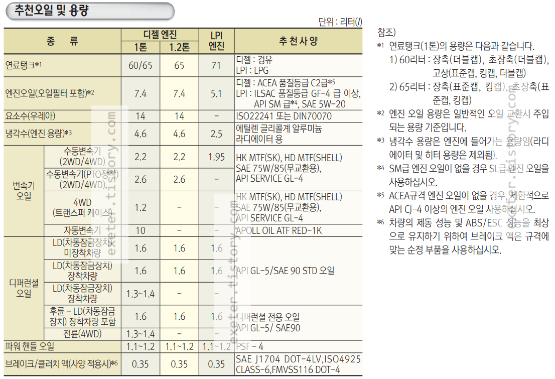 <추천 오일류 용량/규격> - 아래는 1톤/디젤엔진 기준