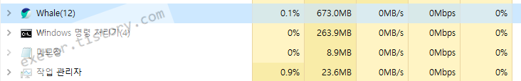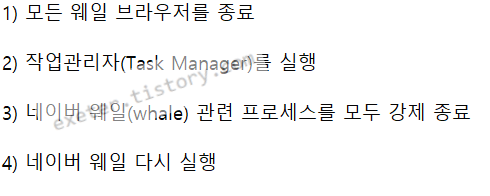 작업관리자에서 아래와 같이 Whale 명칭의 프로세스를 모두 종료 (마우스 오른쪽 클릭, 작업 끝내기 선택)
