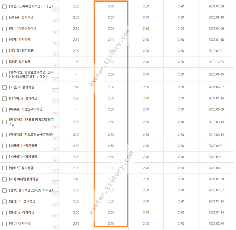 아래 목록에서는 일부 특별한 조건으로 가입해야 고금리를 제시하는 저축은행 상품은 (개인 판단으로)임의로 제거했습니다. 따라서 아래에 제시한 상품의 대부분은 비대면/인터넷 가입이 가능한 상품입니다.