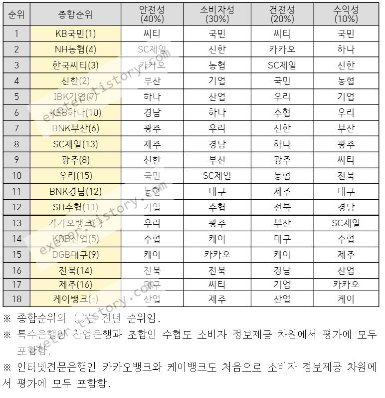 2020년의 경우 종합순위로 나열하자면, 1위 국민은행, 2위 NH농협, 3위 시티은행이었습니다.