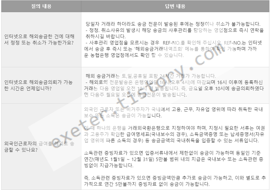 NH농협은행 홈페이지 내용을 참조하여 해외 송금관련된 정보(QnA)를 나열했습니다.