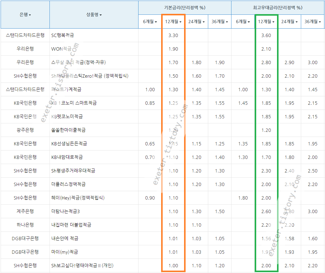 은행 / 상품명 / 정액 적립식 기본금리 (단리 이자(%), 12개월 기준)
