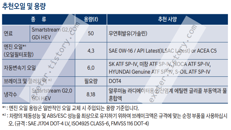 *1 : 엔진 오일 용량은 일반적인 오일 교체 시 주입되는 용량 기준입니다.