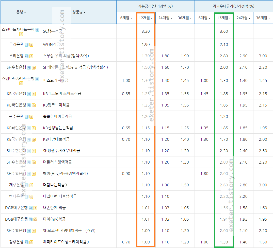 은행 / 상품명 / 정액 적립식 기본금리 (단리 이자(%), 12개월 기준)