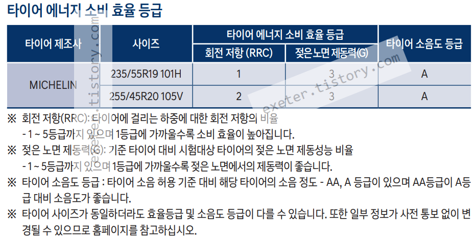 타이어 순정 사이즈 및 에너지 소비 효율 등급은 아래 그림 참고