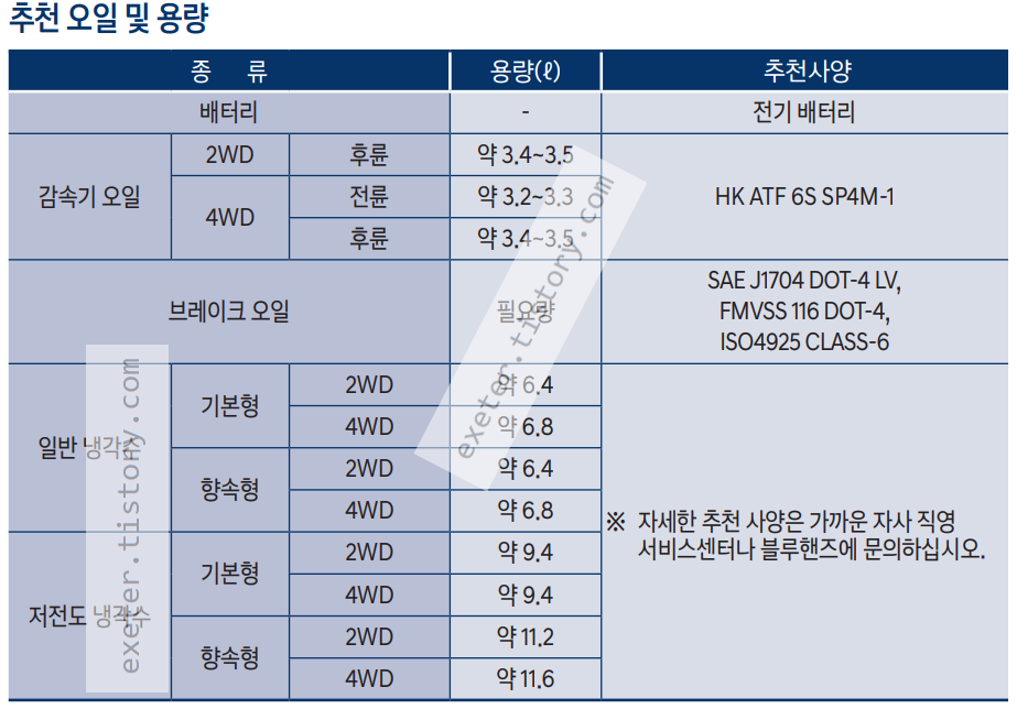 일반 냉각수(기본형 2WD): 약 6.4 사양: 서비스센터 문의