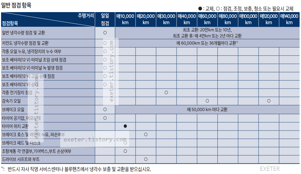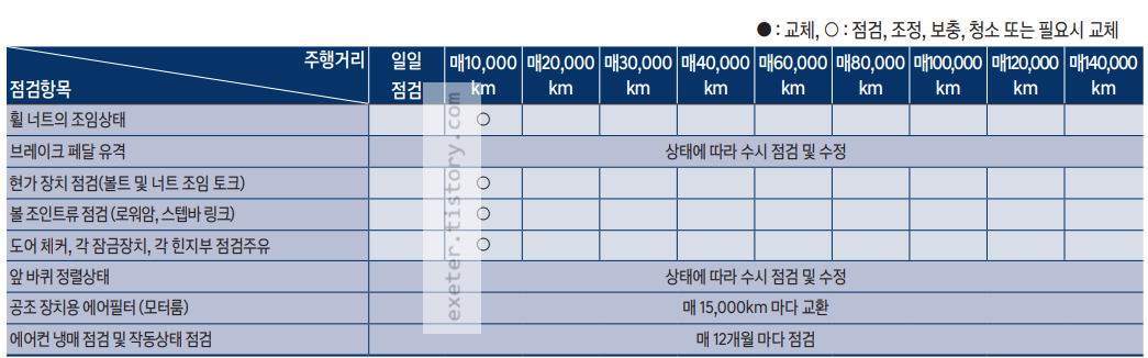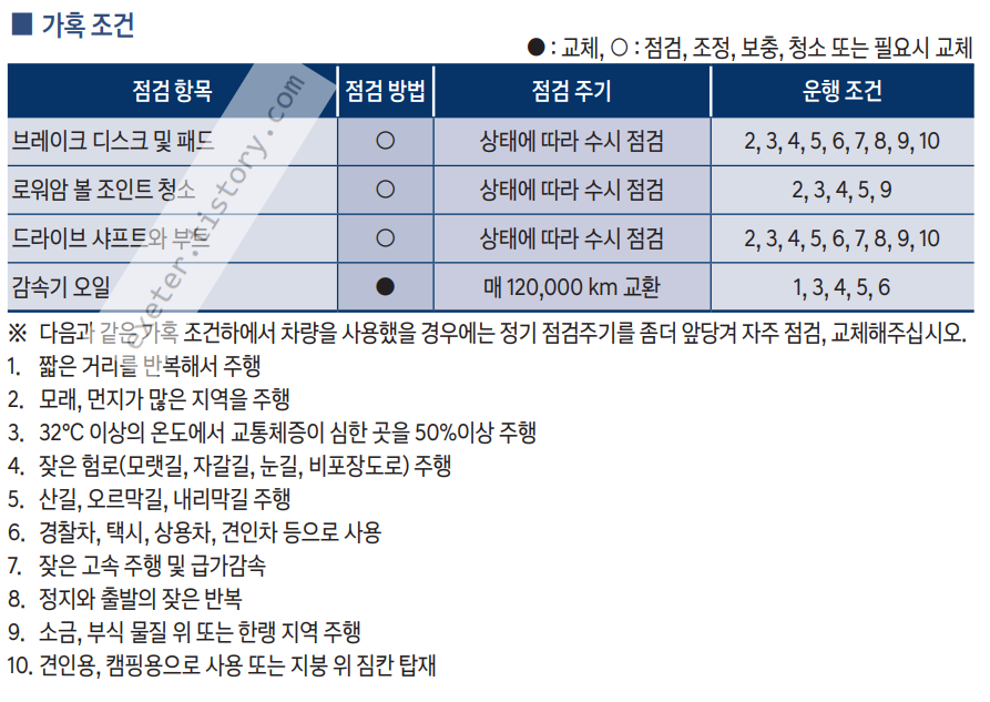 가혹조건 주행의 경우 아래 교체/점검 항목을 참고하세요.