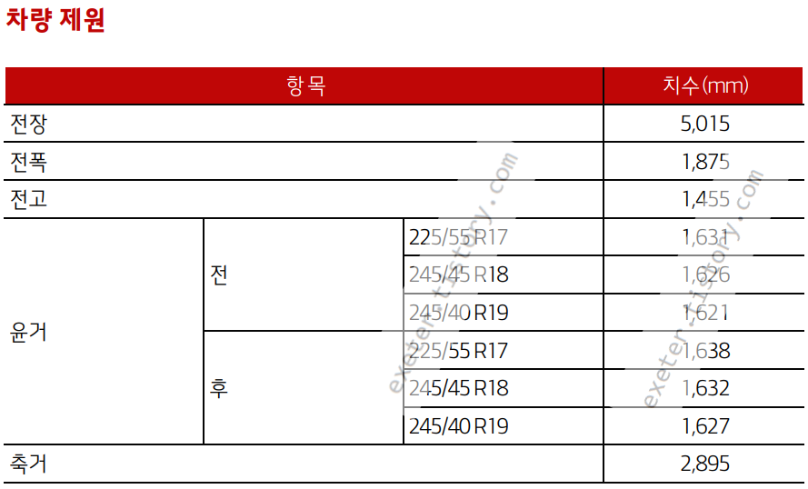 타이어 형식: 225/55R17, 245/45R18, 245/40R19