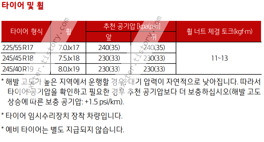 17인치 추천 공기압 (앞): 240kPa (35psi)