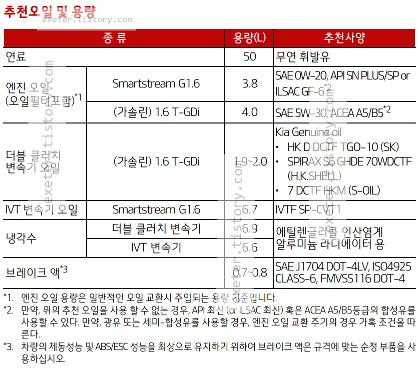엔진오일 (1.6 T-GDi): 4.0 리터 (SAE 5W-30, ACEA A5/B5)