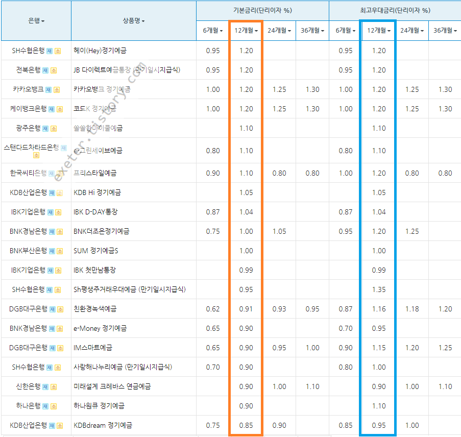 *최고우대금리는 각 은행별로 제시하는 특별한 조건을 만족해야 제공되는 부분으로 해당 은행/상품 상세 정보를 찾아보시기 바랍니다. 최근 우대금리 조건 상품이 많이 사라진 상황입니다.