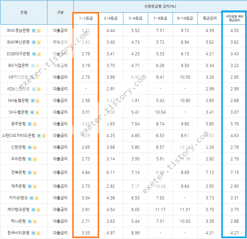 2021년 4월 취급된 신용대출 기준으로, 신용등급 1-2등급 기준, 신용대출 금리를 낮은 순서로 나열하면 아래와 같습니다.