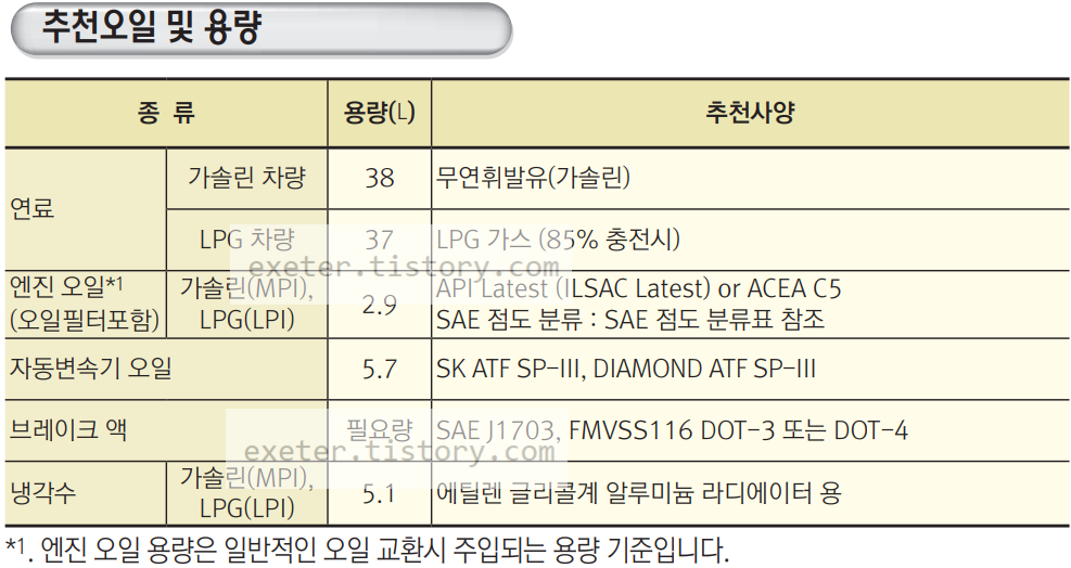 엔진오일 (가솔린(MPI) , LPG): 2.9 리터 (API Latest (ILSAC Latest) or ACEA C5)