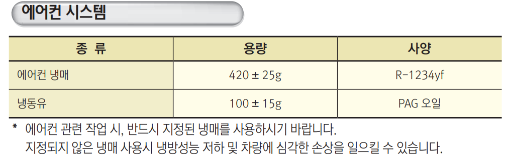 에어컨 시스템 냉매: 420 ± 25g