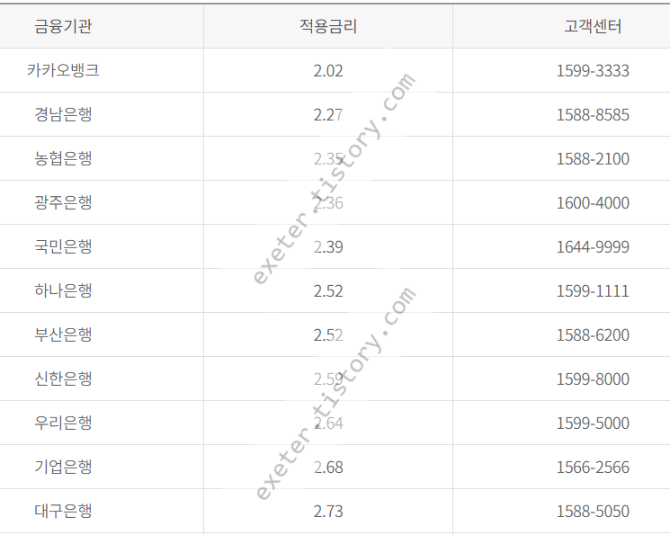 상기 기간 기준으로, 카카오뱅크(2.02%) / 경남은행(2.27%) / 농협은행(2.35%) / 광주은행(2.36%) 이 낮은 금리로 전세자금 대출이 취급되었습니다.