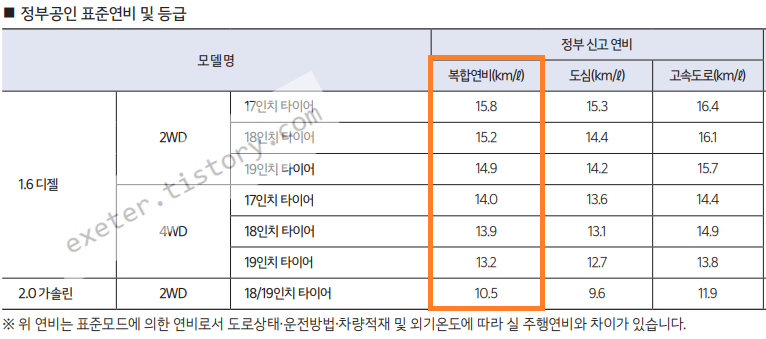 모델 / 타이어 / 복합연비 (km/l)