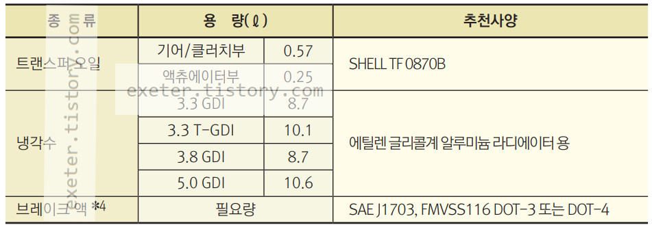 냉각수(3.3 GDI): 10.1 리터(L)