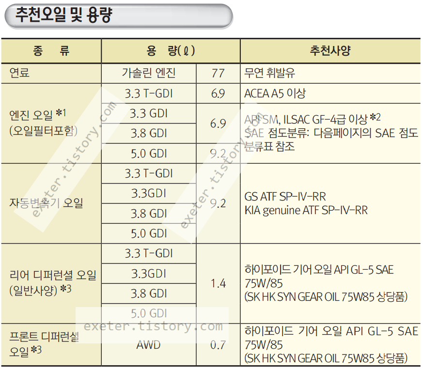 엔진 오일(3.3 T-GDI): 6.9 리터(L) (API SM, ILSAC GF-4급 이상)