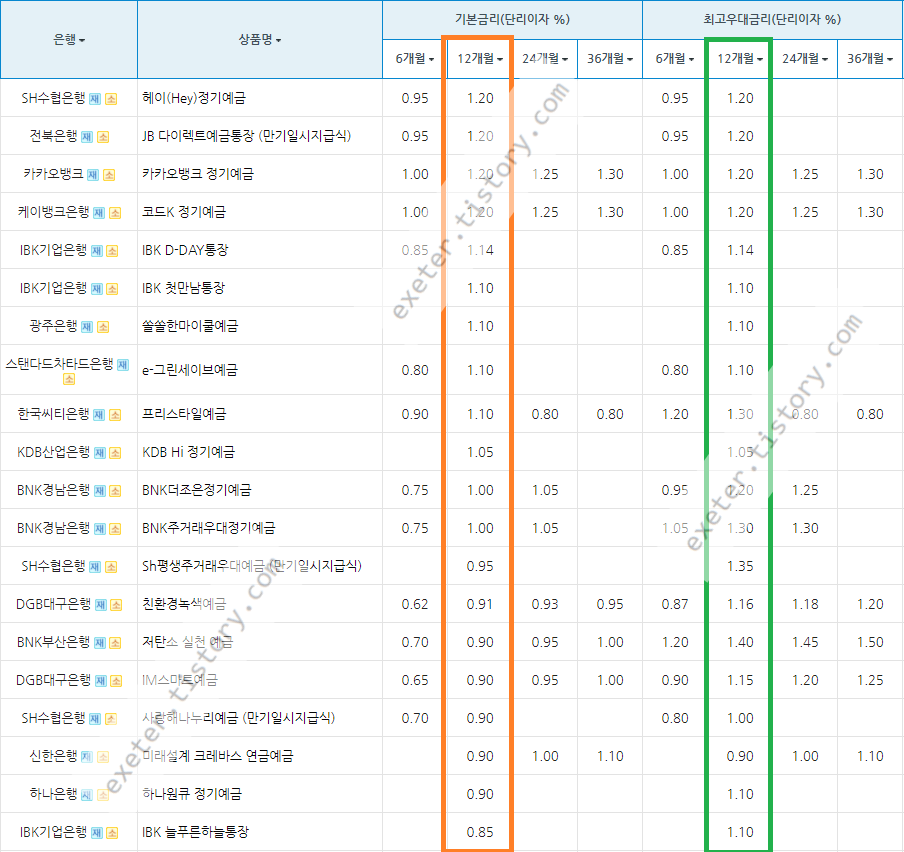 *최고우대금리는 각 은행별로 제시하는 특별한 조건을 만족해야 제공되는 부분으로 해당 은행/상품 상세 정보를 찾아보시기 바랍니다. 최근 우대금리 조건 상품이 많이 사라진 상황입니다.