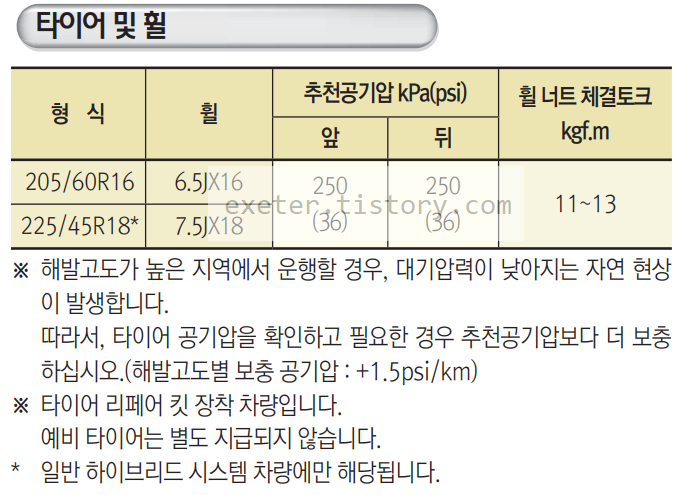 ※ 해발고도가 높은 지역에서 운행할 경우, 대기압력이 낮아지는 자연 현상 이 발생합니다. 따라서, 타이어 공기압을 확인하고 필요한 경우 추천공기압보다 더 보충 하십시오.(해발고도별 보충 공기압 : +1.5psi/km)