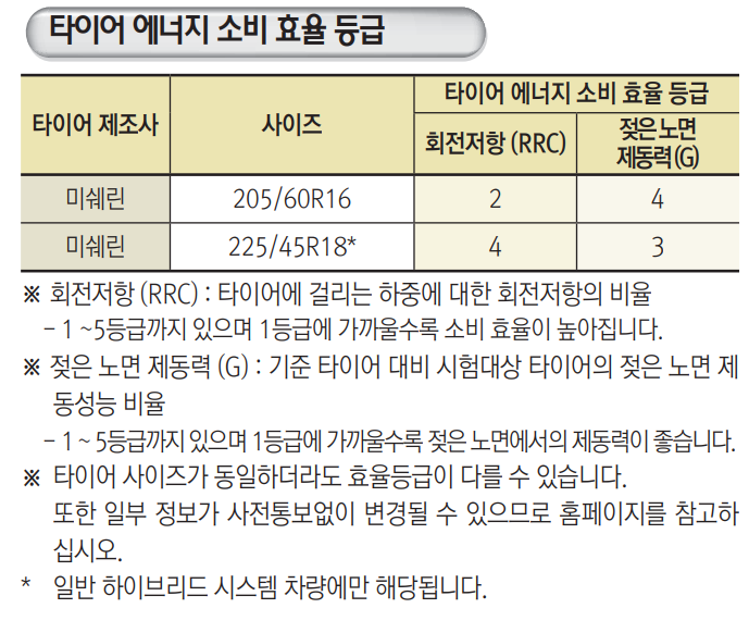 *타이어 순정 사이즈 및 에너지 소비 효율 등급은 아래 그림 참고