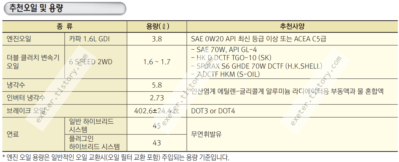 엔진 오일(카파 1.6L GDI): 3.8 리터 (SAE 0W20 API 최신 등급 이상 또는 ACEA C5급)