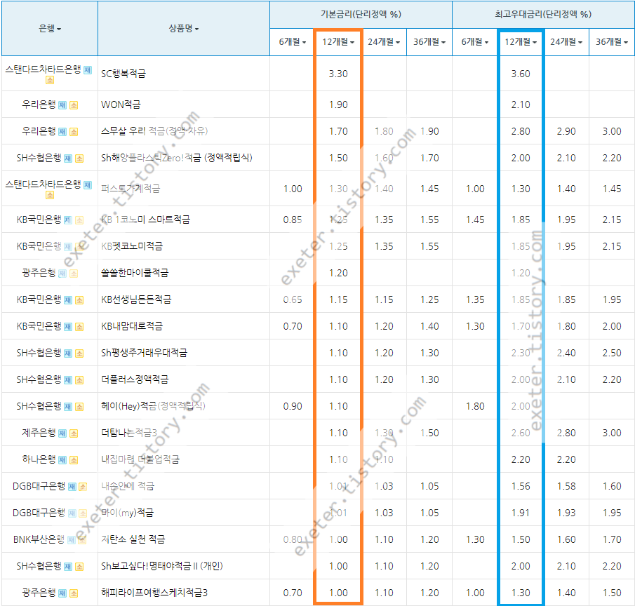 아래는 시중은행 적금 상품의 정기적금 금리를 정액적립식/단리 12개월 기준, 높은 순서로 정렬한 자료입니다.